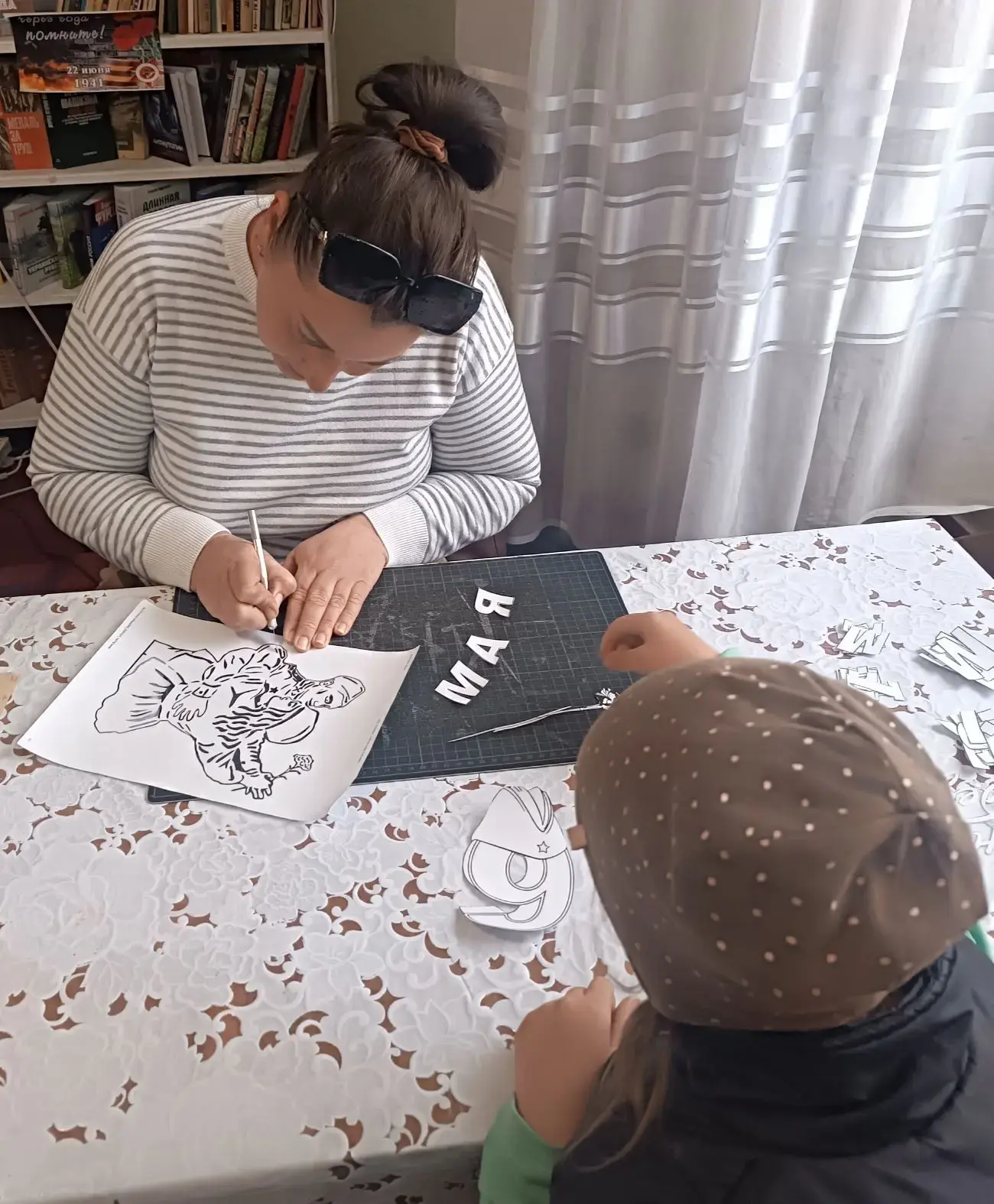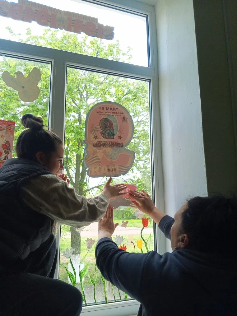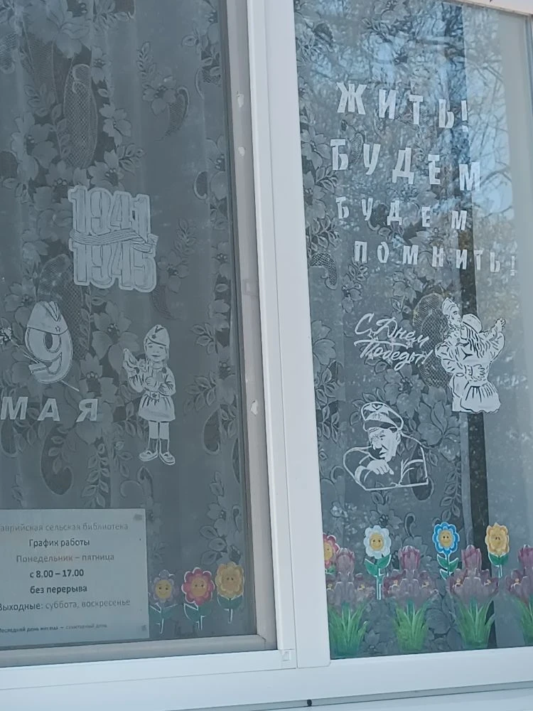 Вместе с детьми библиотекари украсили окна главными символами Победы: рисунками юных читателей, георгиевскими лентами, звёздами, цветами и праздничными надписями. Эти яркие, трогательные композиции создают особую праздничную атмосферу внутри библиотек и украшают улицы сёл, напоминая всем проходящим о великом подвиге народа.