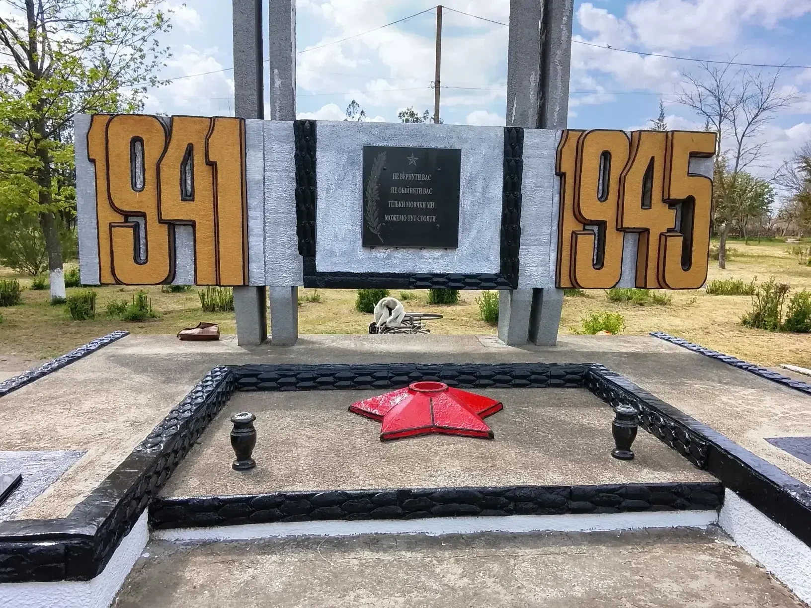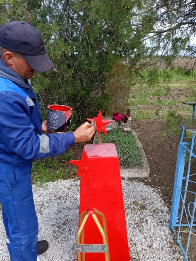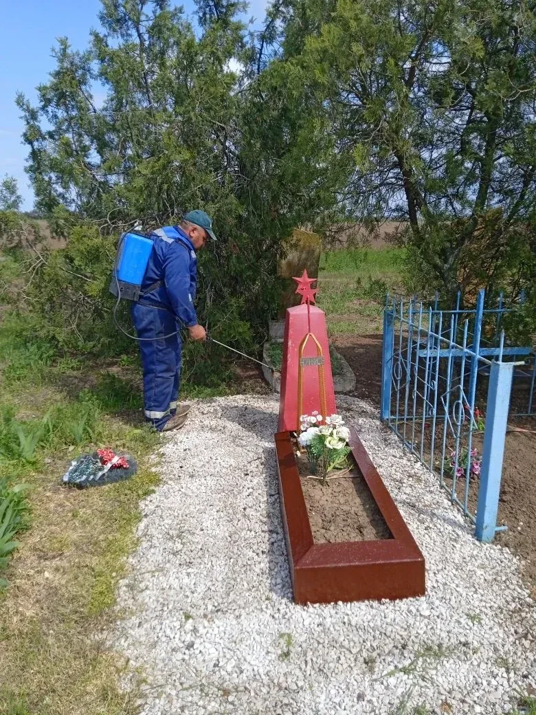 В селе Шевченко коммунальщики провели работы по благоустройству места захоронения танкистов: покрасили надгробие, подсыпали гравий, убрали мусор и сорную траву.