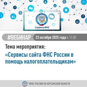 23 октября в 13:00 состоится вебинар для налогоплательщиков Херсонской области на тему «Сервисы сайта ФНС России в помощь налогоплательщикам».Подробная программа вебинара – в карточках. ...