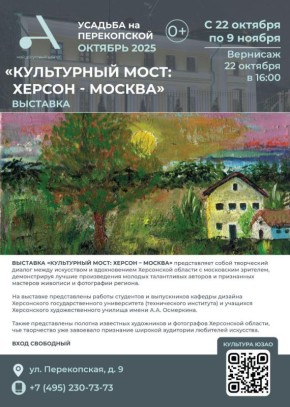 Приглашаем вас на торжественное открытие уникальной художественной выставки «Культурный мост: Херсон – Москва»,которое состоится 22 октября 2025 года в 16:00 в арт-пространстве «Усадьба на Перекопской " (г. Москва, ул. Перекопская...