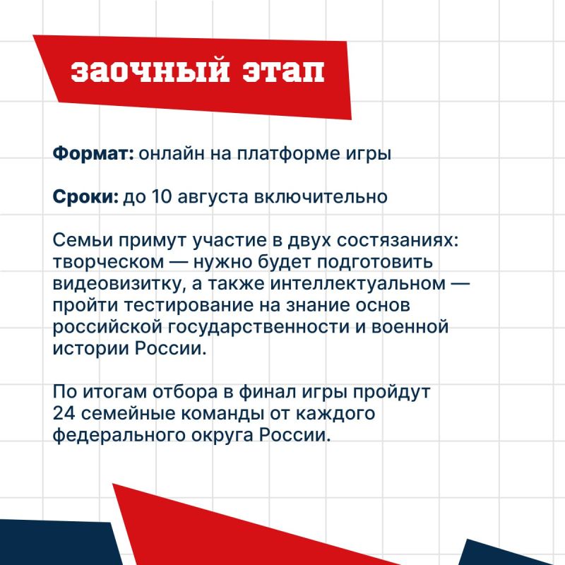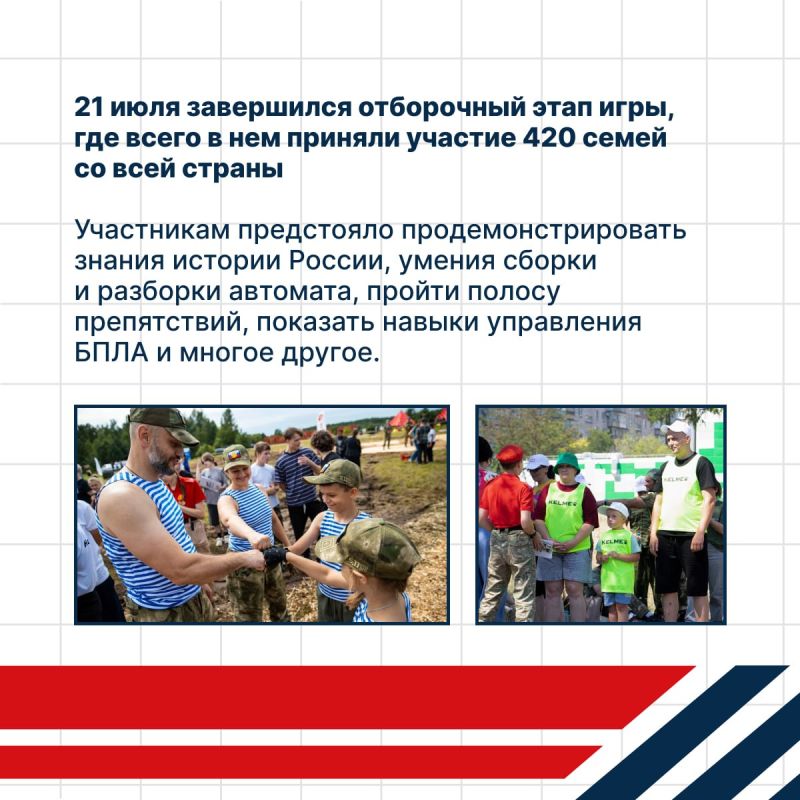 22 июля начинается всероссийский этап военно-патриотической игры, объединившей 79 семейных команд со всей России. Этот уникальный проект сочетает в себе задачи патриотического воспитания, формирования духовно-нравственных ориентиров и укрепления института семьи.