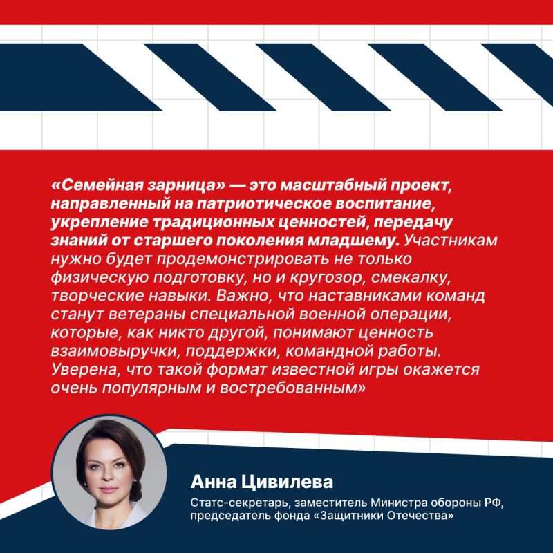 «Участникам нужно будет продемонстрировать не только физическую подготовку, но и кругозор, смекалку, творческие навыки. Важно, что наставниками команд станут ветераны специальной военной операции, которые, как никто другой, понимают ценность взаимовыручки, поддержки, командной работы. Уверена, что такой формат известной игры окажется очень популярным и востребованным», — подчеркнула статс-секретарь — заместитель Министра обороны РФ, председатель фонда «Защитники Отечества» Анна Цивилева.