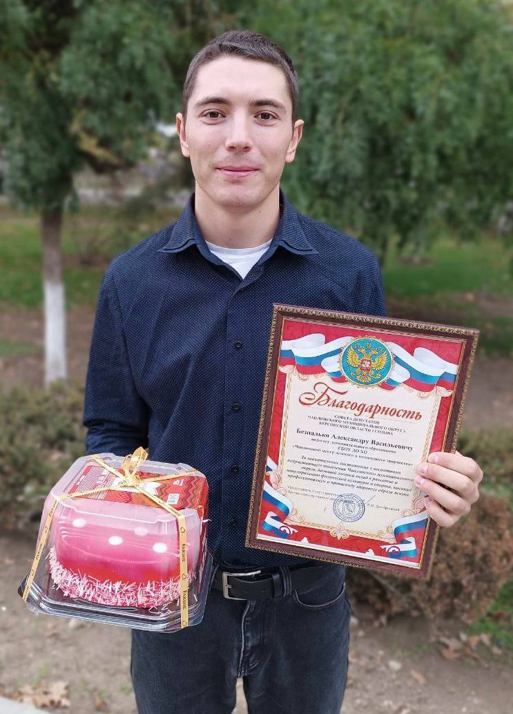 Сегодня педагогу дополнительного образования Безпалько Александру Васильевичу была вручена благодарность от совета депутатов Чаплинского муципального округа Херсонской области за преданность делу и развитие детского спорта.